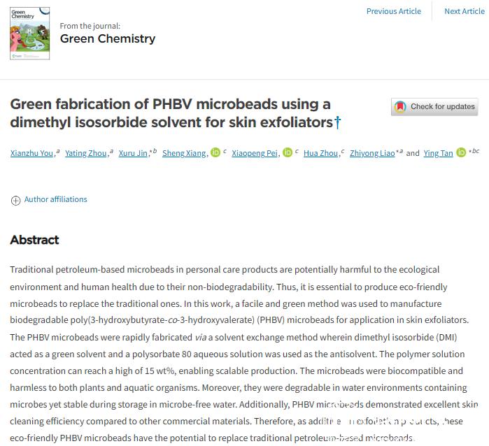 近日,新葡萄8883官网AMG2021级硕士研究生游仙竹同学所在的廖志勇教授课题组联合国科温州研究院谭颖研究员团队以生物基来源的异山梨醇二甲醚为绿色溶剂、聚山梨酯80水溶液为抗溶剂,采用简单的溶剂交换法绿色制备了表面光滑、内部多孔核中空的PHBV微珠(图1)。所制备PHBV微珠环境友好,具有生物相容性,对植物和水生生物无害、在水环境中可降解。此外,与商业的其他材料相比,PHBV微珠具有较好的皮肤清洁效率。因此,所制备的PHBV微珠作为添加剂用于皮肤去角质产品中,有望取代传统的塑料微珠。该研究成果以“Green fabrication of PHBV microbeads using dimethyl isosorbide solvent for skin exfoliators”为题发表于《Green Chemistry》(SCI一区TOP期刊,IF=9.8)上。